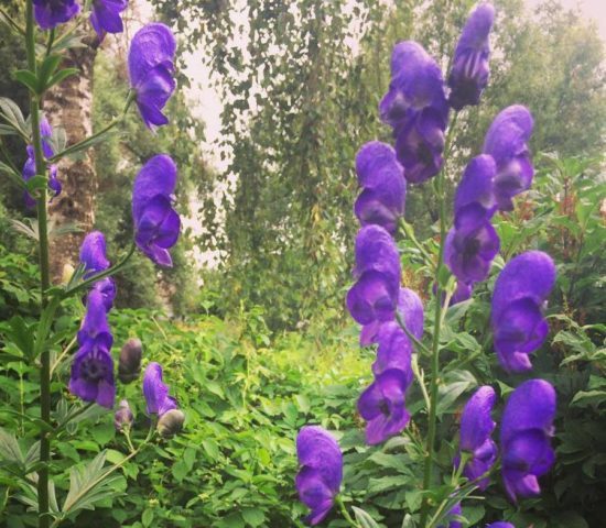 Fisher's Aconite vypadá dobře na pozadí zeleně, stromů