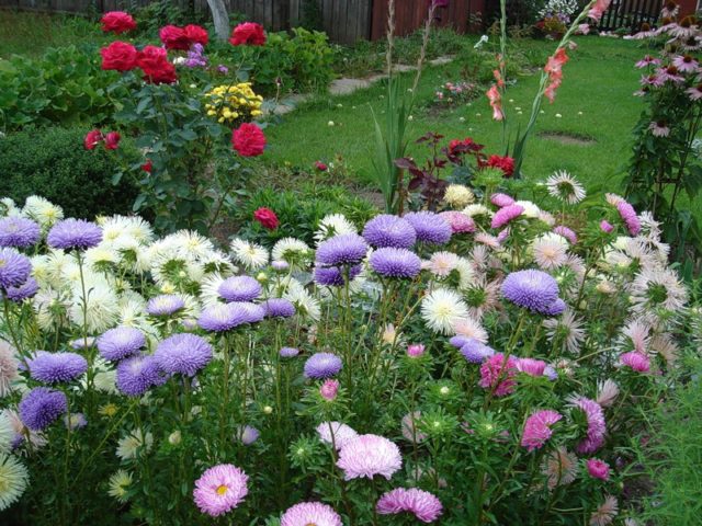 Je dobré kombinovat čínský aster s jarními cibulovitými květy, protože na konci kvetení druhých začíná vytvářet poupata a růst keřů, a tím zachovává dekorativnost květinového záhonu. Měsíček a měsíček jsou ideálními partnery pro callistephus.