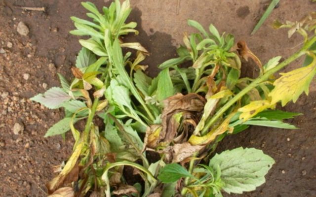 - Fusarium. Ovlivňuje dospělé rostliny. Charakteristickým rysem je ostré zažloutnutí keře na jedné straně, po kterém následuje vyschnutí. Nemocné rostliny nelze léčit, proto je nutné je spálit. Jako preventivní opatření nelze čínskou hvězdu po dobu 5 let vysazovat do stejné zahradní postele. Nejběžnější příčinou je čerstvý hnůj, proto by se při pěstování měl používat pouze humus.