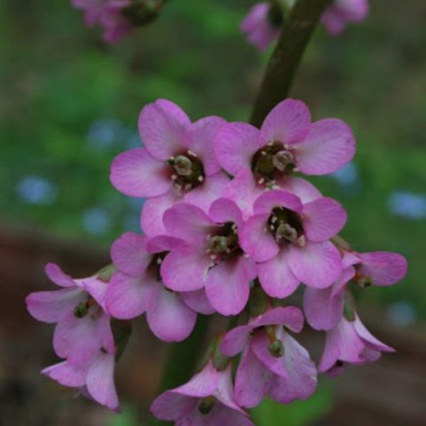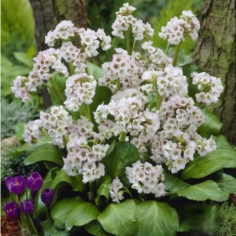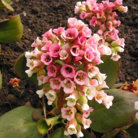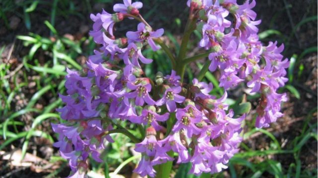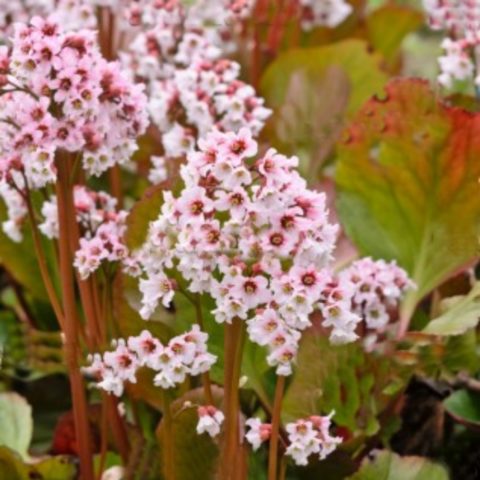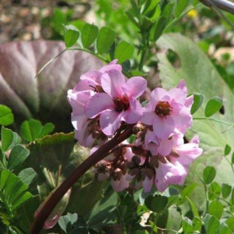 - Pacifik badan... Trvalka tvoří vejčité holé listy světle zelené barvy s lesklým povrchem a konvexní centrální žílou. Okraj desek je mírně zoubkovaný, komorový, což je perfektně kombinováno s jinými zahradnickými plodinami v krajinářském designu. Řapíkaté listy tichomořských bobulí se shromažďují v bazální růžici. Jejich délka je 20 cm a šířka asi 9 cm. Řapíky tohoto druhu jsou mnohem kratší než desky. Přezimované listy se obnovují každý rok. Současně získávají červenohnědý odstín, který dává keři elegantní vzhled. Kvetení tichomořských bobulí nastává brzy na jaře po roztavení sněhu. Jeho trvání je 2-4 týdny.