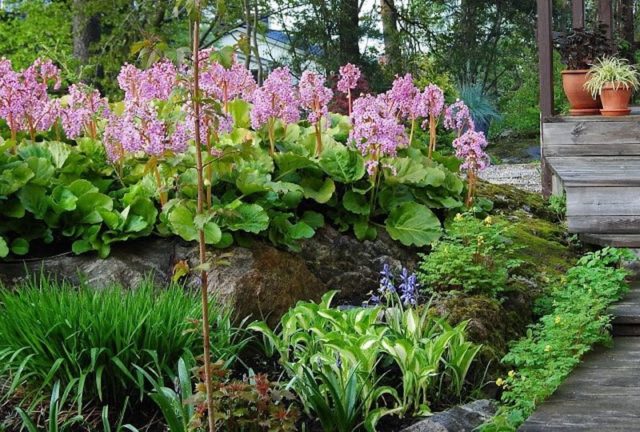 Bergenia je ideální pro výsadbu podél cest a jako popředí na záhonech a záhonech. V krajinářském designu se rostlina také používá k zdobení rybníků a jako jeden z prvků velkého mixborderu.