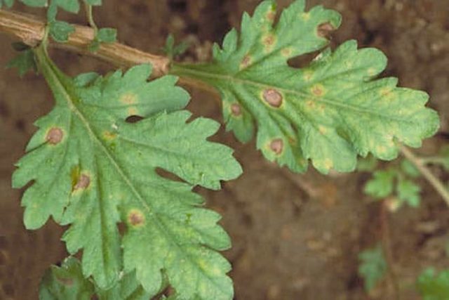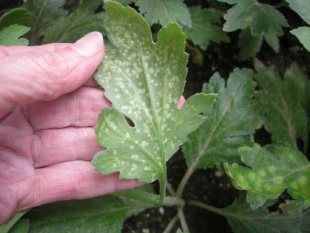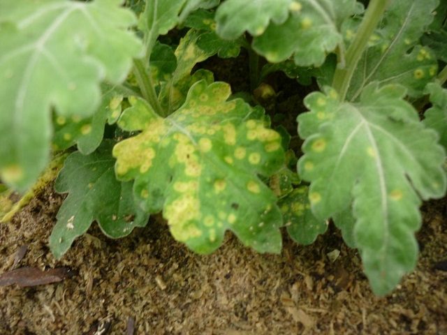 - vzhled tmavých teček a skvrn, někdy listy chryzantémy jsou pokryty skvrnami kvůli narušené vegetaci, někdy jsou tečkami spóry hub nebo larvy škůdců;