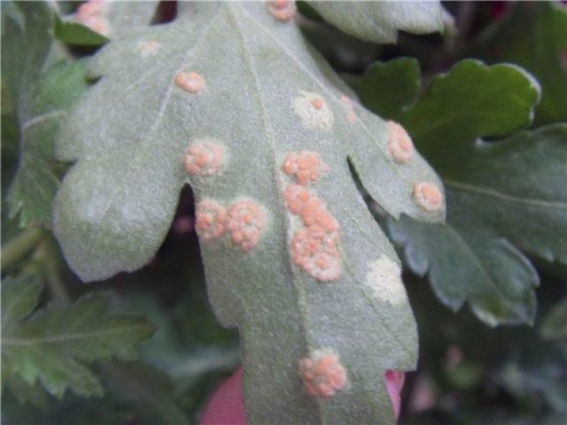 Plísňová choroba má charakteristické příznaky. Nejprve se na listech objeví světlejší oblasti a na spodní straně listových desek se objeví oranžové skvrny moučné struktury. V průběhu času se nemoc šíří květinou, chryzantéma oslabuje a začíná mizet. Taková rostlina již nemůže správně kvést.