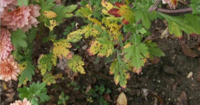 Jednou z nejnebezpečnějších nemocí chryzantém je virová mozaika. Je to docela snadné rozpoznat - na listech infikované rostliny se objevují nerovné skvrny světlého odstínu. Chryzantéma začíná růst pomaleji, její květy se zmenšují a listy zežloutnou, v důsledku čehož se kvetení úplně zastaví.