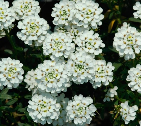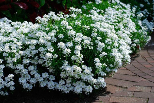 Deštník Iberis jakékoli barvy vypadá dobře na pozadí keřů a stromů