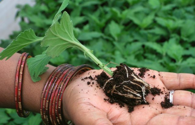 Když výhonky na mateřské rostlině dosáhnou 10 cm a existuje několik internodií, jsou pečlivě odříznuty a ponechány na odříznuté části 2-3 párů listů. Nástroj pro stříhání výhonků je pravidelně dezinfikován. Řezy jsou posypány růstovými stimulanty a mastencem. Z vybraných řízků je nutné odstranit spodní listy a zasadit do dobře navlhčené půdy do hloubky 1,5-2 cm.
