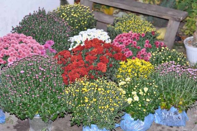 Sférické keře kvetoucích chryzantém najdete v zahradách a parcích, na záhonech a alpských kopcích, často se pěstují v květináčích nebo krabicích - to vše je jedna odrůda, liší se pouze odrůdy rostlin.