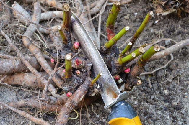 Keře od 3 let lze rozdělit. Je nutné vybrat jednu mladou stonku, odstranit ji z mřížoviny, vykopat růži a oddělit výhonek od kořenů. V budoucnu zasaďte výsledný řez na nové místo, které bylo předtím namočeno v antiseptiku. Současně musí být stonek odříznut a ponechán 8-12 cm, aby se urychlilo zakořenění.
