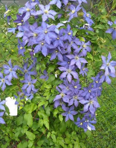 Bush odrůdy Rhapsody je kompaktní, vinice stoupají téměř svisle podél mřížoví, rostou málo do stran, pouze do 60-90 cm, objem v průměru je také do 90 cm, kořenový systém je vyvinut, šíří , hustě vláknitý. Stonky jsou pružné, tenké, silné, držené na podpěrách houževnatými zelenými úponky. Výška řas plamének Rhapsody je malá - od 1,5 do 2,5 m, což závisí na úrodnosti půdy a podmínkách růstu. Jasný, měkký odstín, červenohnědá barva lezeckých stonků vyniká na rozdíl od zelených listů a modré otevřených pupenů.