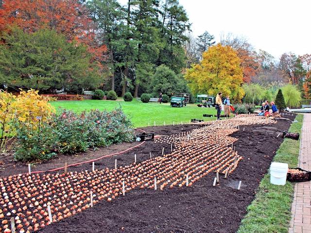 Pokud vytvoříte kompozici ve formě květinového záhonu, je nutné zasadit do středu velké cibule a na okrajích střední. Průměrná květina bude menší a stonek bude kratší. Musíte také udržovat určitou vzdálenost mezi samotnými žárovkami. Je to 6-10 centimetrů. Vzdálenost závisí také na velikosti žárovek.