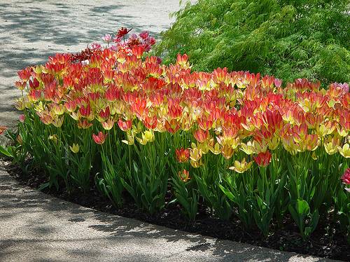 Pro ty, kteří používají tulipány různých odrůd v záhonech, rád bych vám připomněl, že mohou mít různé doby kvetení. Není nutné je vysazovat náhodně. Na záhonech jsou tulipány nejčastěji zasazeny do šachovnicového vzoru. Pokud cestu ohraničují tulipány, zasaďte je do předem vykopaného plochého příkopu.