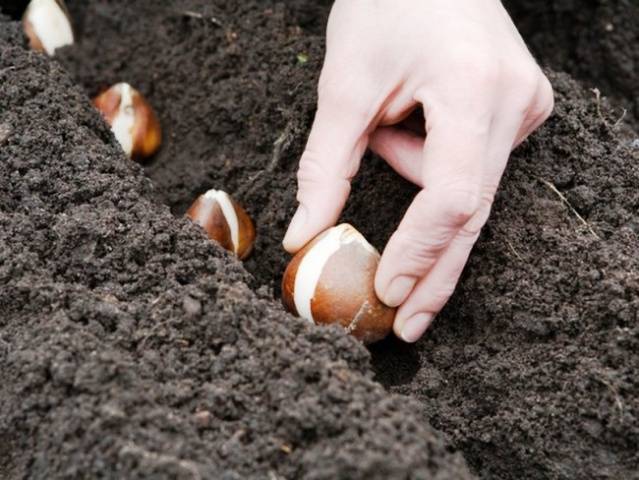 Vykopejte díru nebo výkop určité velikosti. V ní je rozložena cibule tulipánu s oddenkem dolů. Nemusíte na něj tlačit, protože by to mohlo poškodit tenké kořeny. Poté je příkop nebo díra pokryta zemí. Po vysazení všech cibulí je půda pečlivě vyrovnána. Pokud je slunečné počasí a neočekává se déšť, můžete půdu lehce zalévat.