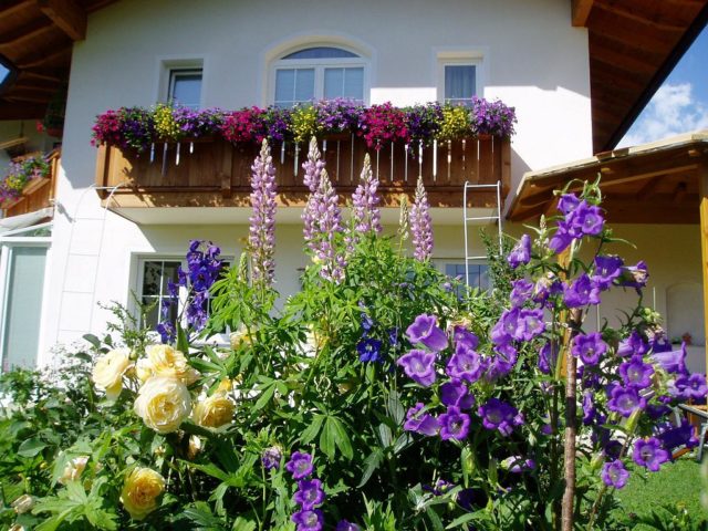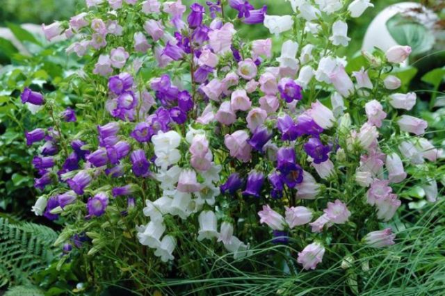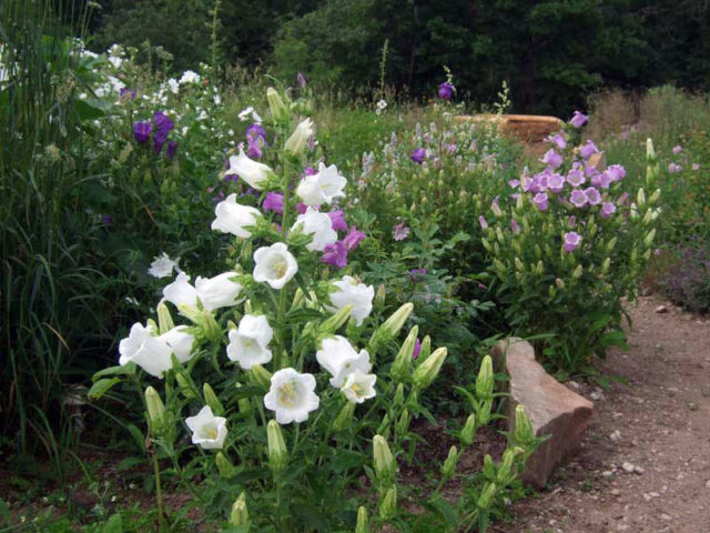Při úpravě zahrady se bienále používá jak samostatně, tak v kombinaci s jinými rostlinami. Na fotografii prostředního zvonu Color Mix je vidět, že se používá i jiné odrůdy: