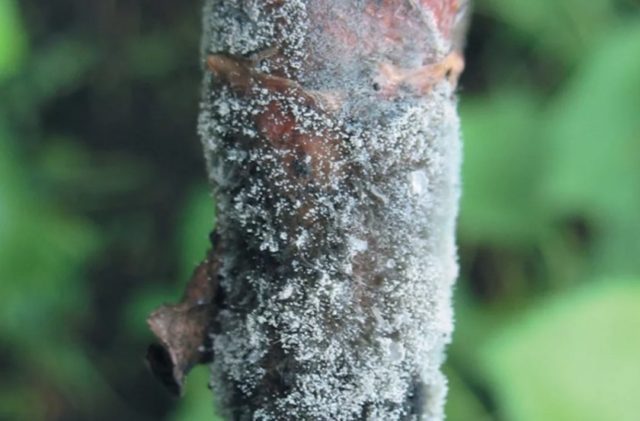U padlí jsou listy pokryty bílým květem a prostřední zvon se vyvíjí horší