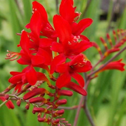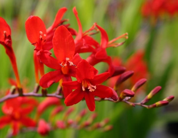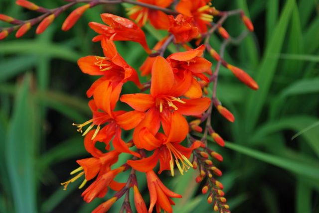 Na vysokých a silných stopkách vytrvalé krokosmie, jak je vidět na fotografii, jsou husté panikulární nebo hrotovité květenství, skládající se z několika nálevkovitých květů žlutého, červeného nebo oranžového odstínu. Montbrecia se vyznačuje střídavým kvetením pupenů, což umožňuje prodloužit dobu květu a zachovat dekorativitu až do podzimu.