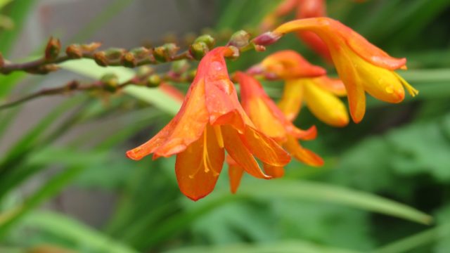 Tenké půvabné listy krokosmiček jsou kombinovány s krásnými oranžovými květy