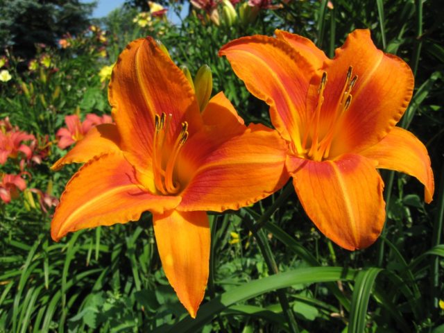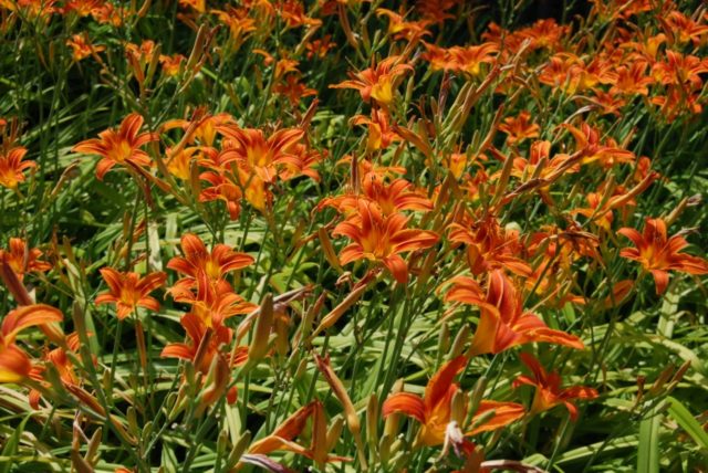Intenzivní oranžové daylilies vypadají dobře s krokosmií. V tomto případě hrají roli hlavní dekorace květinového záhonu.