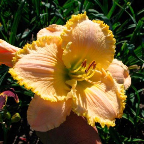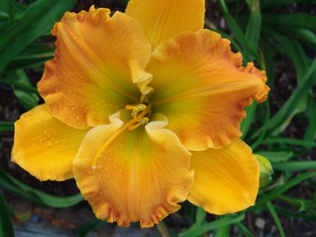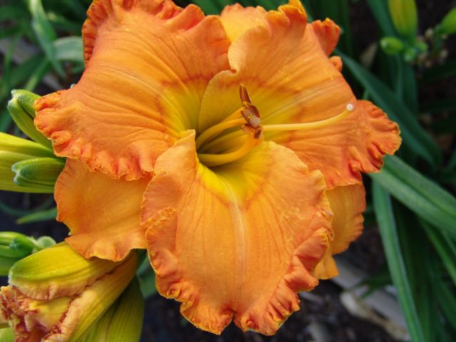 Je to denivka s velkými oranžovými květy. Za dobrých podmínek dosahují průměru 20 cm. Dochází k mírné úlevě. Široký okraj zlatého odstínu přešel na odrůdu od předka - Garyho Colbyho. Jeho okraj je esteticky zvlněný. Výška stopek je 80 cm.
