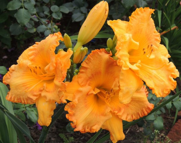 Cibulovité rostliny jsou vysazeny v popředí a denivka v pozadí. To vám umožní zabránit přehřátí cibulovitých rostlin a dát záhonu jas a extravaganci. Zároveň nebude vypadat vzdorovitě. U oranžových denivek budou dobrými společníky okrasné rostliny, jako je catnip, dahlia, kniphofia a Wernicka longifolia.
