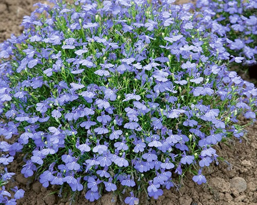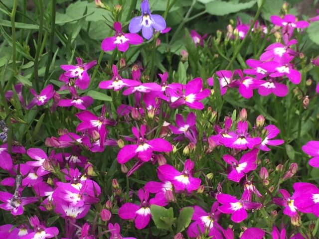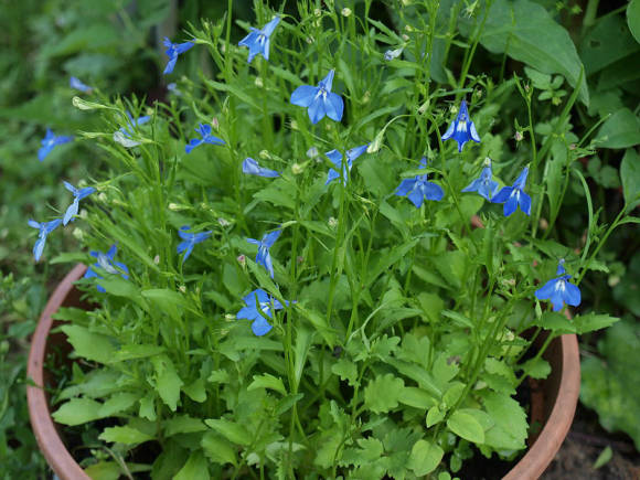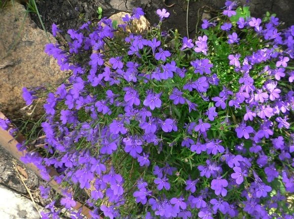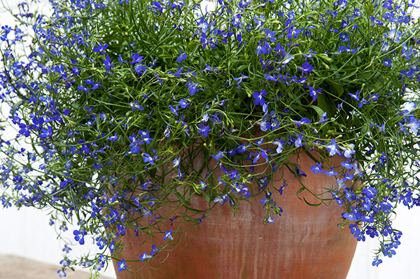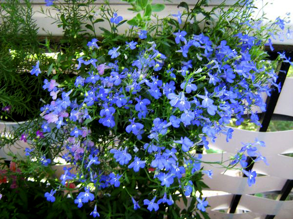 Keř lobelia erinus (na obrázku) dává mnoho malých květů různých odstínů: světle modrá, nasycená nebo tmavě modrá, fialová, bílá.