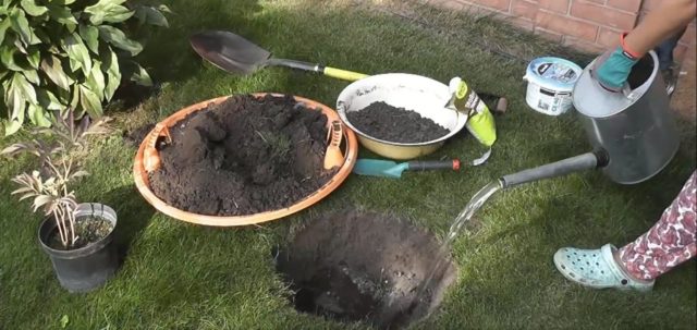 Pokud je sazenice zakoupena s uzavřeným kořenem, je umístěna do jámy spolu s hliněnou hrudkou.