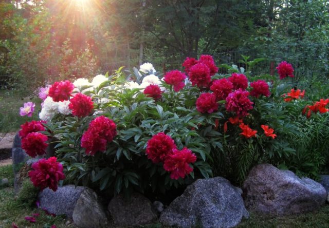 Směs různých odrůd pivoňky s daylily vypadá dobře