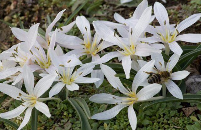 Rozkvět Colchicum Regel začíná okamžitě po roztavení sněhu.