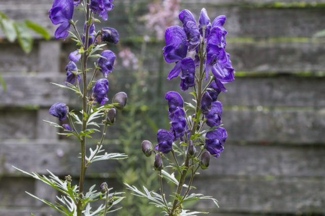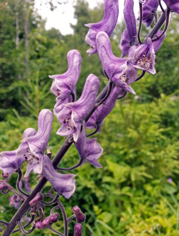 Rostlina tvoří květenství ve formě volného kartáče se šedofialovými lístky, nepravidelného válcového tvaru s hubicí. Aconite vysoký má jiné jméno - helma. Je spojen s tvarem pupenů, podobně jako helma. Vrcholy okvětních lístků rostly společně a spodní jsou ohnuté ve formě hledí. Květenství vypadá velmi mocně a agresivně, což je podporováno silnými stopkami a výhonky.