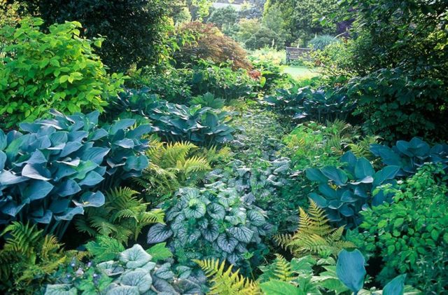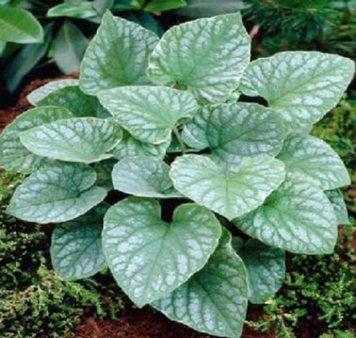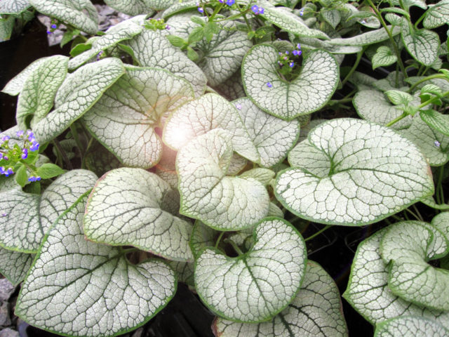 5. Lukinovo sklo (Brunnera macrophylla Looking Glass) je krátký keř (až 35 cm) se stříbřitými listy. Vypadá dobře ve stínu velkých stromů a mírně zastíněné oblasti jsou také vhodné k výsadbě. Dokonale harmonizuje v kompozicích s jinými rostlinami (skalky, skalky, ohraničení).