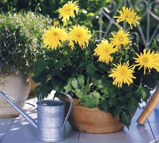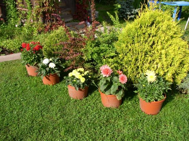 Pěstování georgín v květináčích je výhodné, protože je lze umístit kdekoli: na verandě, v zahradě mezi stromy, podél cest. Řada hrnců může vizuálně rozdělit oblast na zóny.