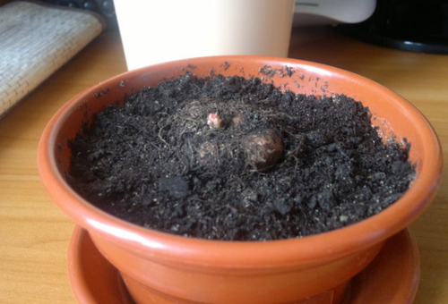 Uzliny Begonia jsou zasazeny bez prohloubení, horní část by měla být umístěna nad zemí.Nezkušení zahradníci často dělají chyby při výsadbě, zvláště pokud se pupeny ještě neprobudily. Musíte zasadit uzlík s konvexní částí dolů do mokré půdy a zářez by měl být nahoře!