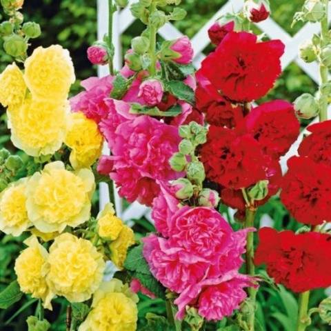 - Sléz růžová nebo obyčejná Stockrose (Álcea rósea)... Navzdory jménu má květy různých barev: od bílé po tmavě třešňovou téměř černou. Květy jsou velké, zvonovité, jednoduché, do průměru 12 cm. Rostlina je vysoká, může dorůst až 2 m. Svou povahou je to trvalka. Kvetení začíná ve druhém roce. Na místě přistání může přežít několik let, ale běží divoce.