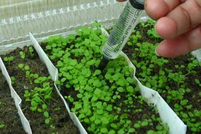 - Kapkovou závlahu pomocí stříkačky s odstraněnou jehlou. Při takovém zalévání musí být stříkačka s vodou mírně zahrabána do země poblíž sazenic a vytlačit vodu. Místo injekční stříkačky můžete také použít malý klystýr.