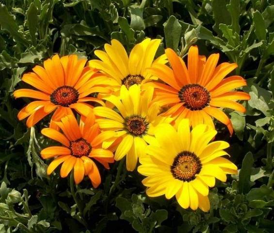 - Dimorphoteca se zářezem. Liší se zvláštním tvarem listů. Výška rostliny 30-40 cm. Velikost květů je až 7 cm v průměru. Oranžové nebo žluté květenství s tmavě hnědým středem. Dimorfoteka kvete velmi hojně a zakrývá dvorky jasným, luxusním kobercem.
