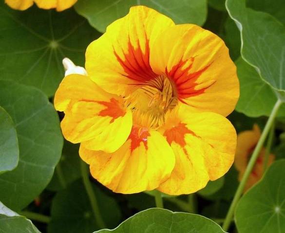 Obrovské množství odrůd této kultury vám umožňuje vybrat si nejlepší volbu pro zdobení vaší zahrady. Nízko rostoucí rostliny tedy mají výšku ne více než 30 cm, zatímco lezení na nasturtium může tvořit révy dlouhé až 3 m. Listy a stonky nasturtia jsou masité, jasně zelené. Květy lze malovat v krémové, oranžové, žluté, červené barvě a jejich odstínech. Průměr květů může dosáhnout 5 cm, doba kvetení je dlouhá, což je důležitá výhoda kultury. V důsledku kvetení nasturtium vytváří ovoce - malé ořechy, které jsou semeny. Používají se k množení rostlin, přípravě léčiv a potravin.