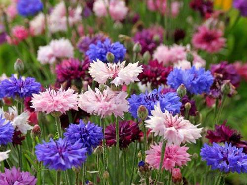 Navzdory skutečnosti, že většina květin chrpy je spojena s modrou, existují žluté, bílé a fialové odrůdy tohoto nenáročného a známého ročního období. Semena klíčí do týdne a kvete asi 50-65 dní po klíčení.