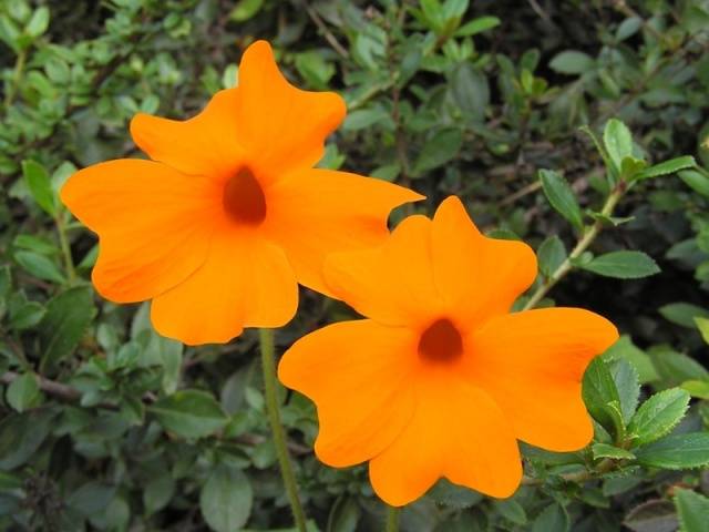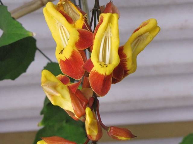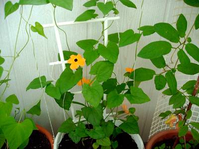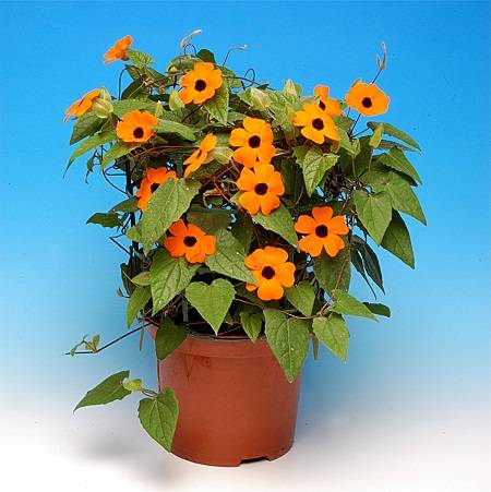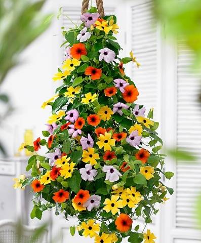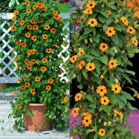 Ale nejpůsobivější tunbergie bude vypadat ve svislých květináčích nebo zavěšených květináčích a koších, když její výhonky krásně sestoupí a vytvoří vodopád květin a zeleně.