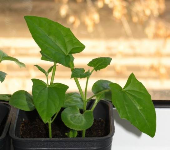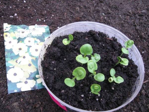 Semena tunbergie můžete pěstovat jak v běžných středně velkých miskách, tak v samostatných šálcích. Mladé rostliny dobře snášejí sběr a opětovnou výsadbu, takže způsob pěstování závisí na množství prostoru, který můžete věnovat sazenicím tunbergie, a na čase, který chcete věnovat jejich opětovné výsadbě. Pokud máte málo místa, ale hodně času, pak je lepší zpočátku zasít semena tunbergie do společné nádoby, abyste při rozmístění tří až čtyř listů přesadili klíčky do samostatných nádob.