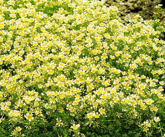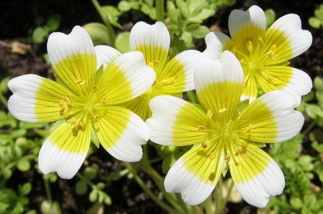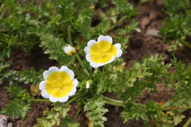 Takto vypadá rozkvět jednoho z nejcennějších představitelů rodiny limnanthus pro kosmetický průmysl - limnanthus bílý nebo limnanthus alba.