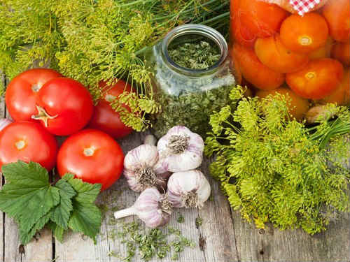 Pro konzervování budete potřebovat zralá rajčata s hustou dužinou, mírně nezralá, vhodná jsou také hnědá. Měly by být přibližně stejné velikosti, s celou kůží, nemačkané, bez skvrn různého původu nebo stop po chorobách, spálení sluncem. Kromě toho budete potřebovat sladkou papriku a bylinky, které vám dodají určitou chuť a samozřejmě celou řadu koření, které se při tradiční konzervování zeleniny nelze obejít.