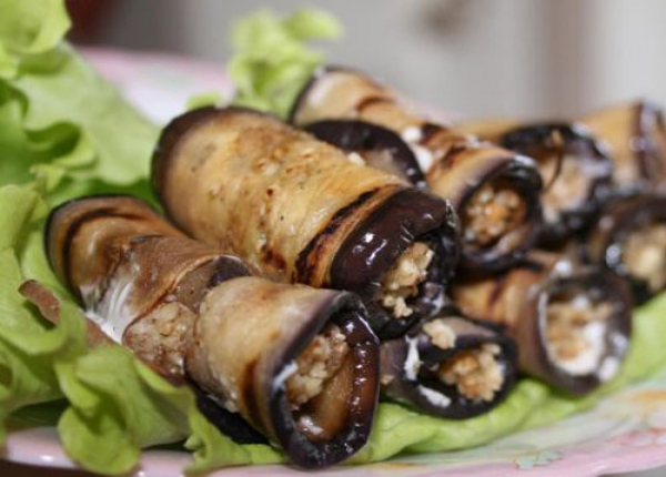 - Na každý talíř lilku se nanese malé množství náplně a pak se zabalí do role. Jsou podávány ke stolu jako občerstvení.