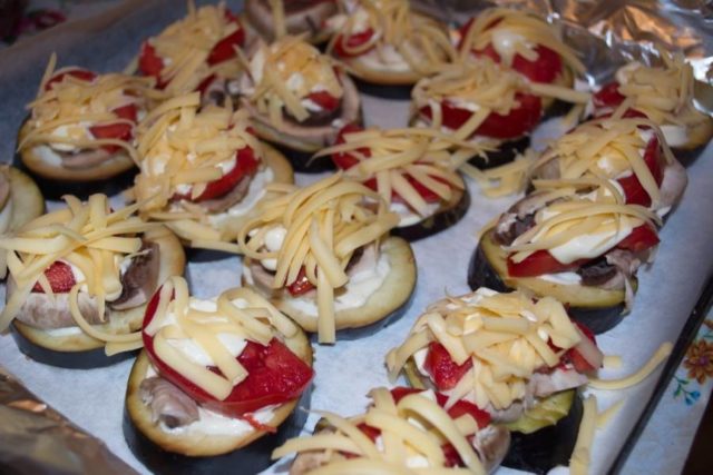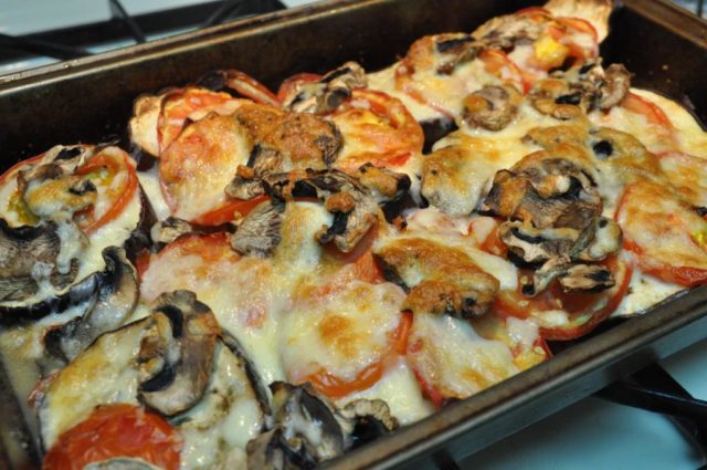 - Vložte lilek do vymasteného pekáče. Houby jsou umístěny nahoře. Na nich jsou umístěna rajčata. Na závěr je malé množství zakysané smetany se strouhaným sýrem.