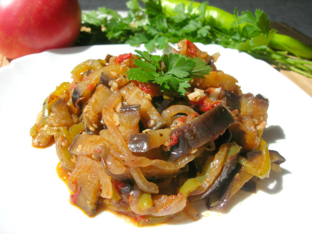 - Tmavě ovocný lilek je umyt, oloupán a nakrájen na dlouhé plátky. Jsou smažené z každé strany na pánvi s trochou oleje.