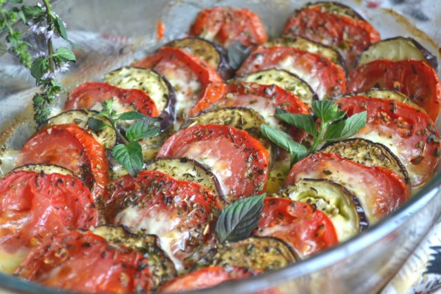 - Lilek se promyje solí a poté se rozloží na dno vymasteného plechu. Na ně jsou umístěna rajčata a česnek je pečlivě rozdělen.