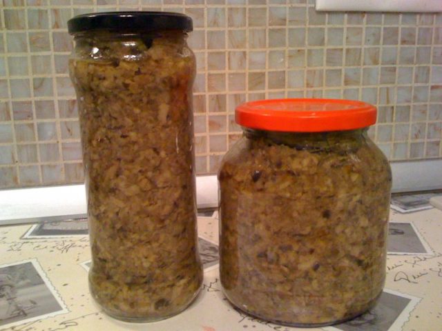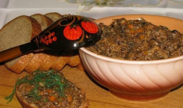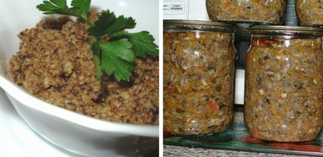 Cibuli nakrájejte nadrobno a poduste na trochě oleje. Poté k tomu rozložili houbovou hmotu a dusili asi hodinu na mírném ohni. Do hotového předkrmu se přidává ocet a trochu soli podle vašich kulinářských preferencí. Miska se podává na stůl nebo srolovaná ve sklenicích pro další skladování.