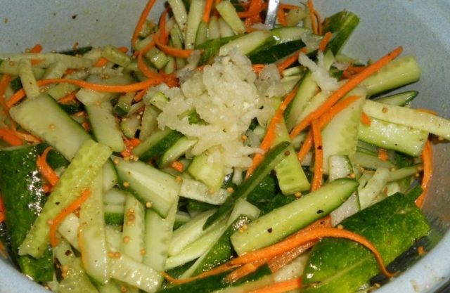 - Nastrouhejte mrkev. K tomuto účelu se nejlépe hodí korejské struhadlo. Míchejte okurky.