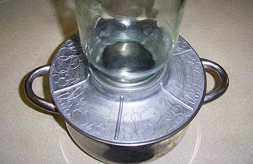 Nejprve tedy naplňte hrnec nebo jakoukoli jinou nádobu vodou. Kolik vody nalijete, závisí na počtu plechovek, které chcete sterilizovat. Pokud máte velké třílitrové plechovky nebo celkový počet plechovek přesahuje 10, je lepší naplnit nádobu na polovinu jejího objemu. Na horní část pánve je položen kovový povlak na plechovky. Hrnec postavte na vysokou teplotu, aby se voda co nejrychleji přivedla k varu. První dávku plechovek lze před vařením umístit na destičku dnem vzhůru, aby se postupně zahřívaly. Po varu lze ohřev mírně snížit, aby voda v pánvi nebublala, ale mírně vařila.