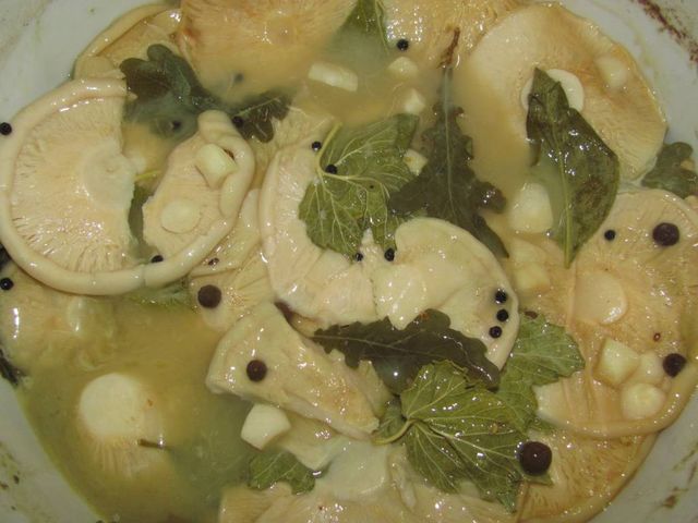 - Připravte horkou marinádu na mléčné houby.Nalijte 1 litr vody česneku, 2 listy třešní a rybízu, 1 bobkový list, 3 ks. hřebíček, 1,5 lžíce. l. cukr, 2 lžíce. l. sůl, vařte.