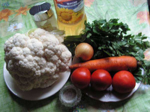 - Po umytí zeleniny rozdělte květák na malé květenství a nakrájejte rajčata na polovinu. Mrkev nakrájejte na kruhy o tloušťce ne jeden a půl centimetru. Bulharský pepř - v podélných pruzích.