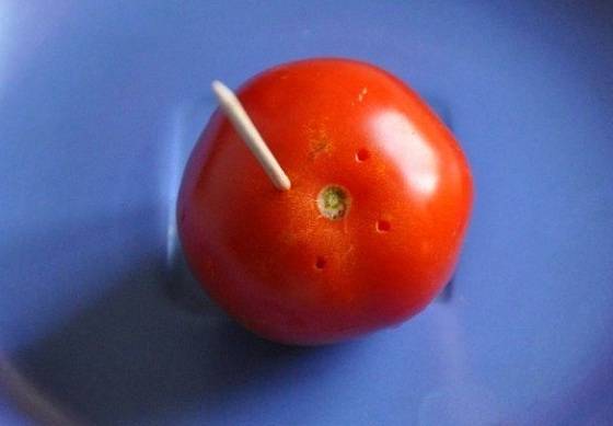 - Rajčata umyjeme a osušíme. U každého rajčete, uvnitř a kolem stonku, provádíme několik vpichů párátkem.